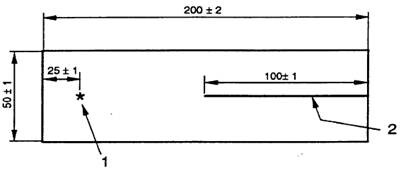 試樣尺寸:矩形長條,長(200±2)mm,寬(50±1)mm,每個試樣從寬度方向的正中切開一長為(100±1)mm的平行于長度方向的裂口。在條樣中間距未切割端(25±1)mm處標