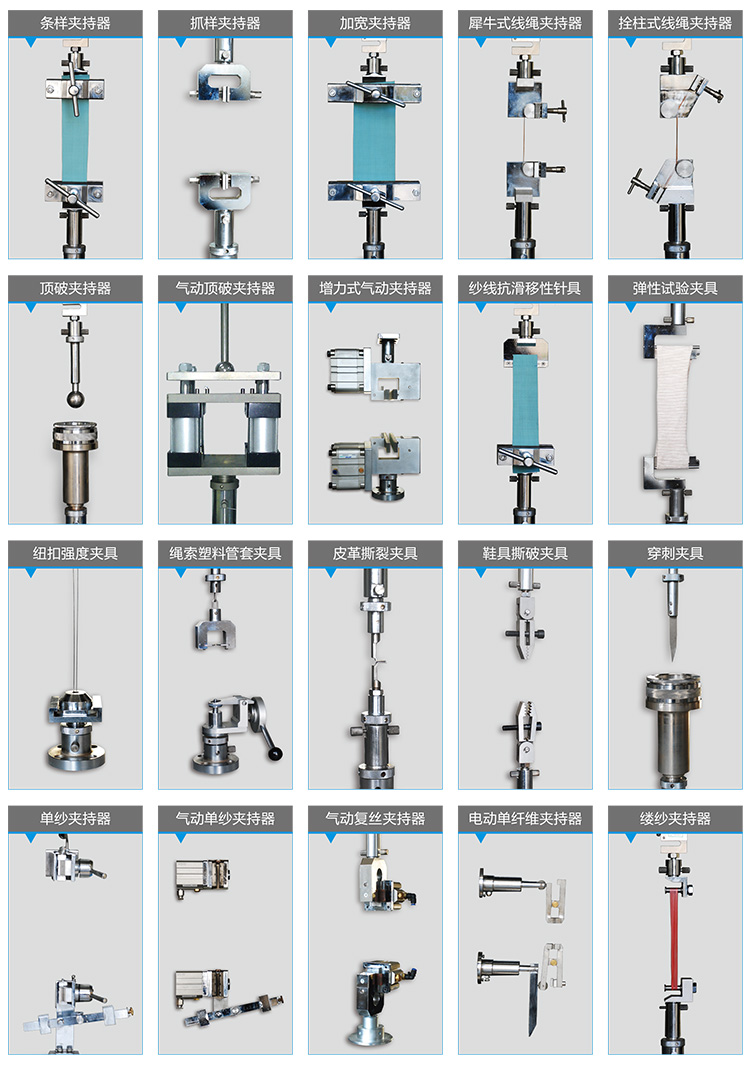 條樣夾持器、抓樣夾持器、加寬夾持器、犀牛式線繩夾持器、拴柱式線繩夾持器、頂破夾持器、氣動頂破夾持器、增力式氣動夾持器、紗線抗滑移夾具、彈性試驗夾具、紐扣強度夾具、繩索塑料管套夾具、皮革撕裂夾具、鞋具撕破夾具、穿刺夾具、單紗夾持器、氣動單紗夾持器、氣動復絲夾持器、電動單纖維夾持器、縷紗夾持器