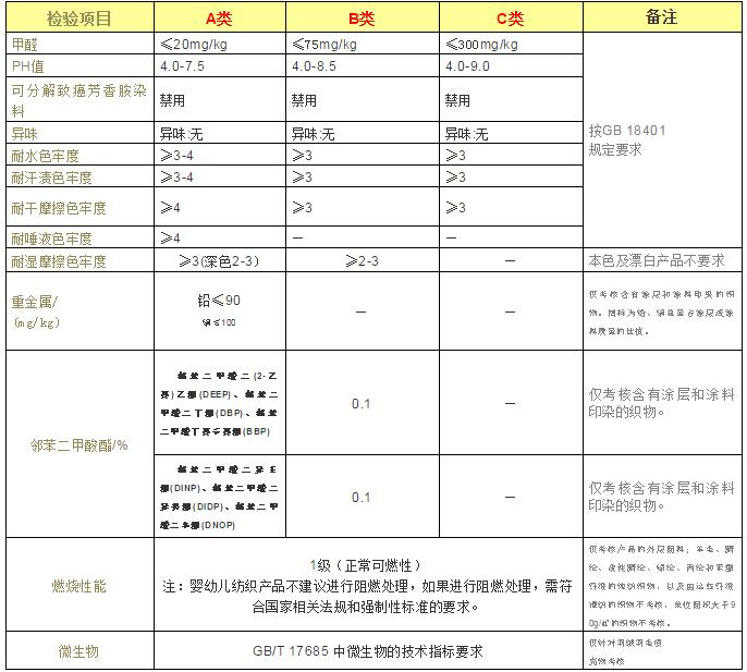 A、B、C類與GB 18401的安全技術類別一一對應。
